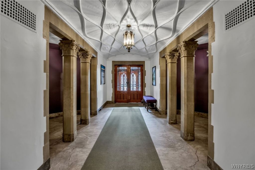 Experience timeless elegance at 800 West Ferry, one of Buffalo's most distinguished addresses, designed by renowned architect Duane Lyman. This beautifully maintained building welcomes residents with a spectacular 1920s lobby and classic architectural details. This turn-key one-bedroom residence blends historic charm with refined modern updates. The bright, spacious living room features gleaming refinished parquet floors, a decorative fireplace with elegant mantel, custom built-ins, and abundant natural light-creating a warm and sophisticated living space. The tastefully renovated kitchen offers granite countertops, breakfast bar seating, stainless steel appliances, stylish fixtures, and additional pantry storage, perfect for everyday living and entertaining. The gracious primary suite serves as a peaceful retreat with extensive built-in storage and a private en-suite bath with tub/shower and beautiful vanity. A convenient powder room is located off the welcoming entry foyer. Residents enjoy 24-hour security, a shared terrace, designated off-street parking, attic storage, and the convenience of all utilities included in the HOA. Ideally situated just steps from Elmwood Village, with easy access to Delaware Park, the Medical Campus, and the theatre district. Located within a historic district, the property may also qualify for SHPO tax credits for eligible renovation projects-an exceptional opportunity to enhance a truly special home.