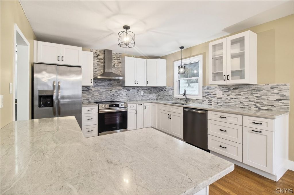 You know those homes where you can tell the owners truly cared about every detail? This is one of them. This beautifully updated split-level has been thoughtfully upgraded inside and out. Step outside and you'll immediately notice the fresh landscaping, rock walls, and a private backyard that feels like your own retreat. The yard even features apple and peach trees, adding a little charm (and fresh fruit!) to your outdoor space. Imagine summer mornings on the deck with coffee in hand while the trees are in bloom. The covered front porch is perfect for relaxing evenings, and the exterior has seen major improvements including new siding with foam insulation, Versetta stone accents, a new insulated front door, and overhead garage door. Inside, the updates continue with a brand-new kitchen featuring quartz countertops, new appliances, and a bright living room highlighted by a large picture window that fills the space with natural light. The primary bathroom has been remodeled, and additional improvements include updated lighting and ceiling fans, new basement windows, a Ring security system, and a newly finished garage floor with drain. Located in the Whitesboro School District in a highly desirable area, this home blends comfort, thoughtful upgrades, and a beautiful outdoor setting. Move right in and start enjoying it from day one.